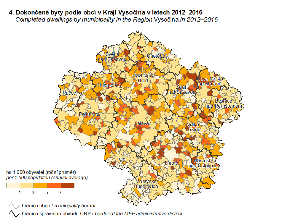 4. Dokončené byty podle obcí v Kraji Vysočina v letech 2012–2016