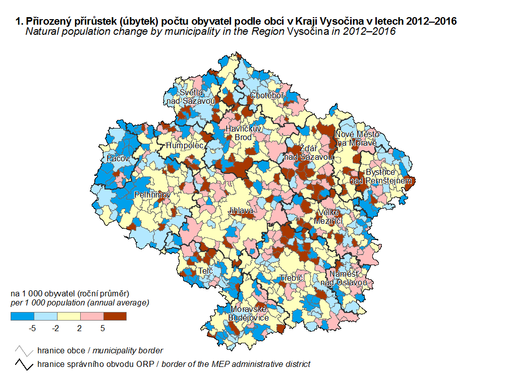 1. Přirozený přírůstek (úbytek) počtu obyvatel podle obcí v Kraji Vysočina v letech 2012–2016