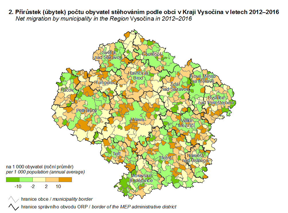 2. Přírůstek (úbytek) počtu obyvatel stěhováním podle obcí v Kraji Vysočina v letech 2012–2016