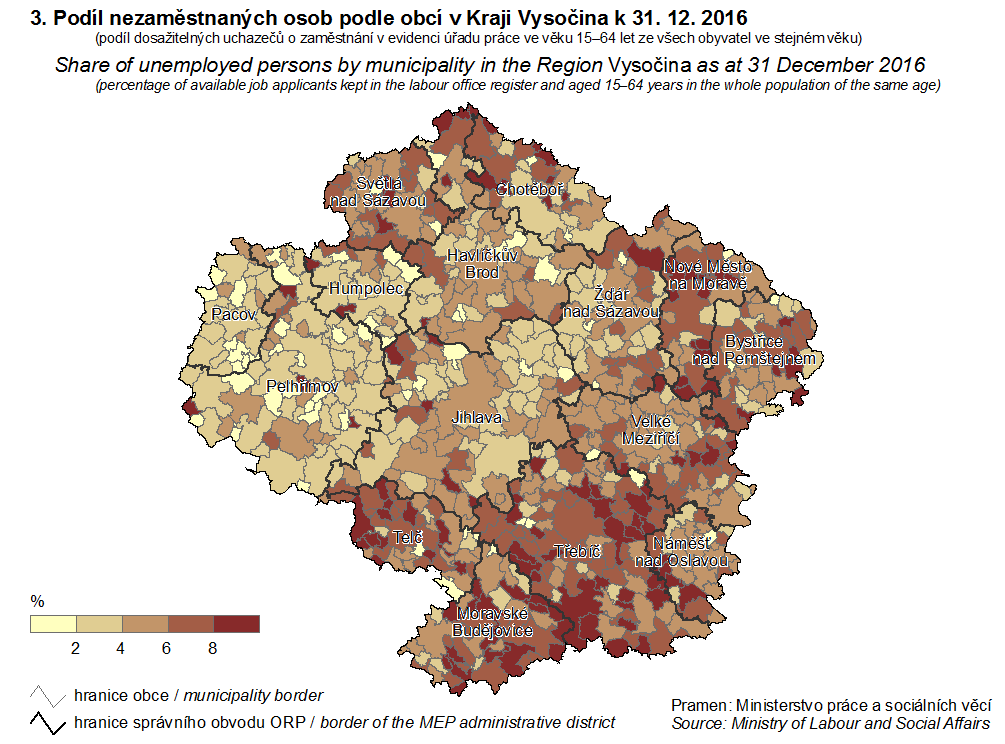 3. Podíl nezaměstnaných osob podle obcí v Kraji Vysočina k 31. 12. 2016