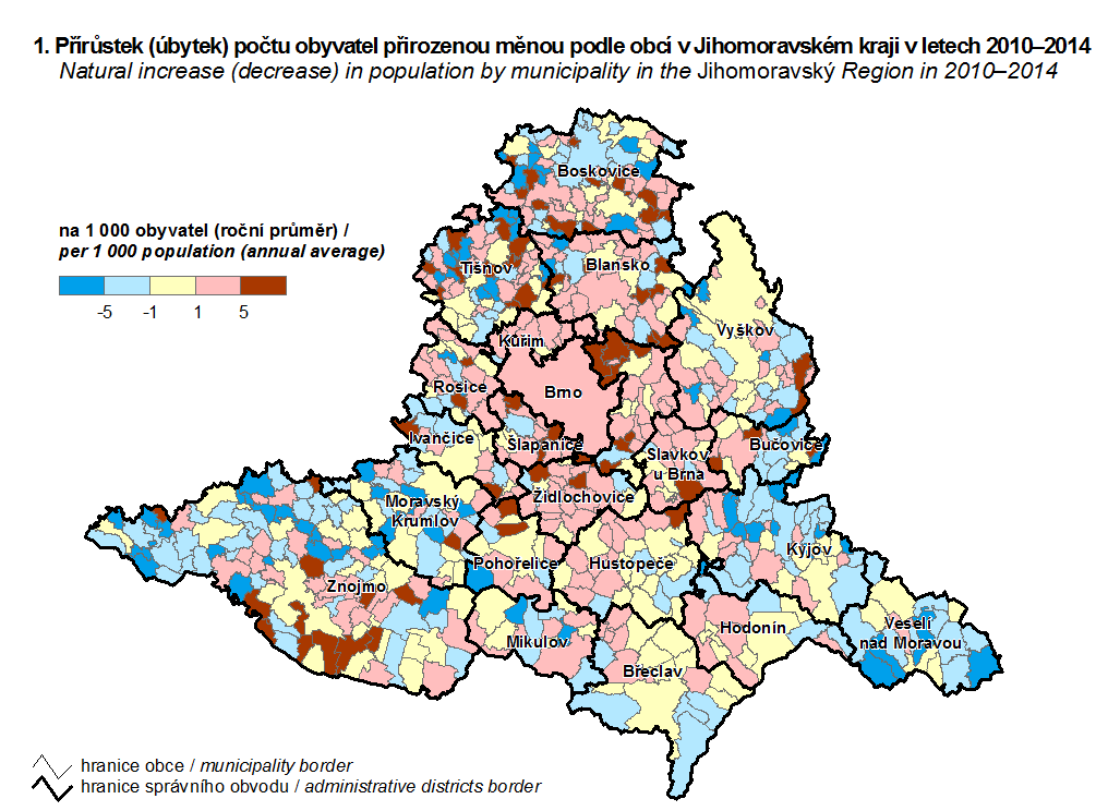 1. Přírůstek (úbytek) počtu obyvatel přirozenou měnou podle obcí v Jihomoravském kraji v letech 2010–2014