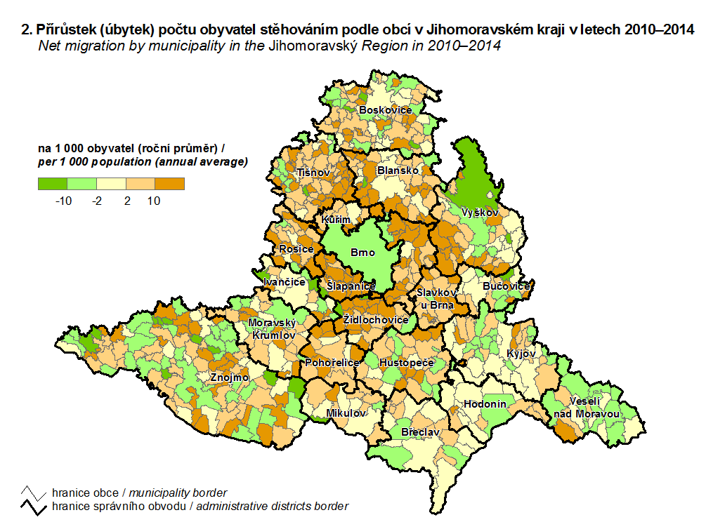 2. Přírůstek (úbytek) počtu obyvatel stěhováním podle obcí v Jihomoravském kraji v letech 2010–2014