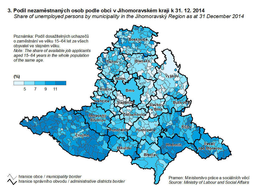 3. Podíl nezaměstnaných osob podle obcí v Jihomoravském kraji k 31. 12. 2014