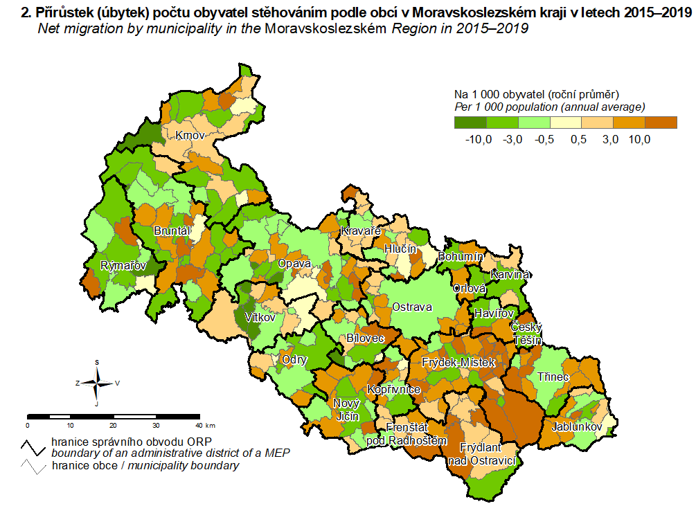 2. Přírůstek (úbytek) počtu obyvatel stěhováním podle obcí v Moravskoslezském kraji v letech 2015–2019
