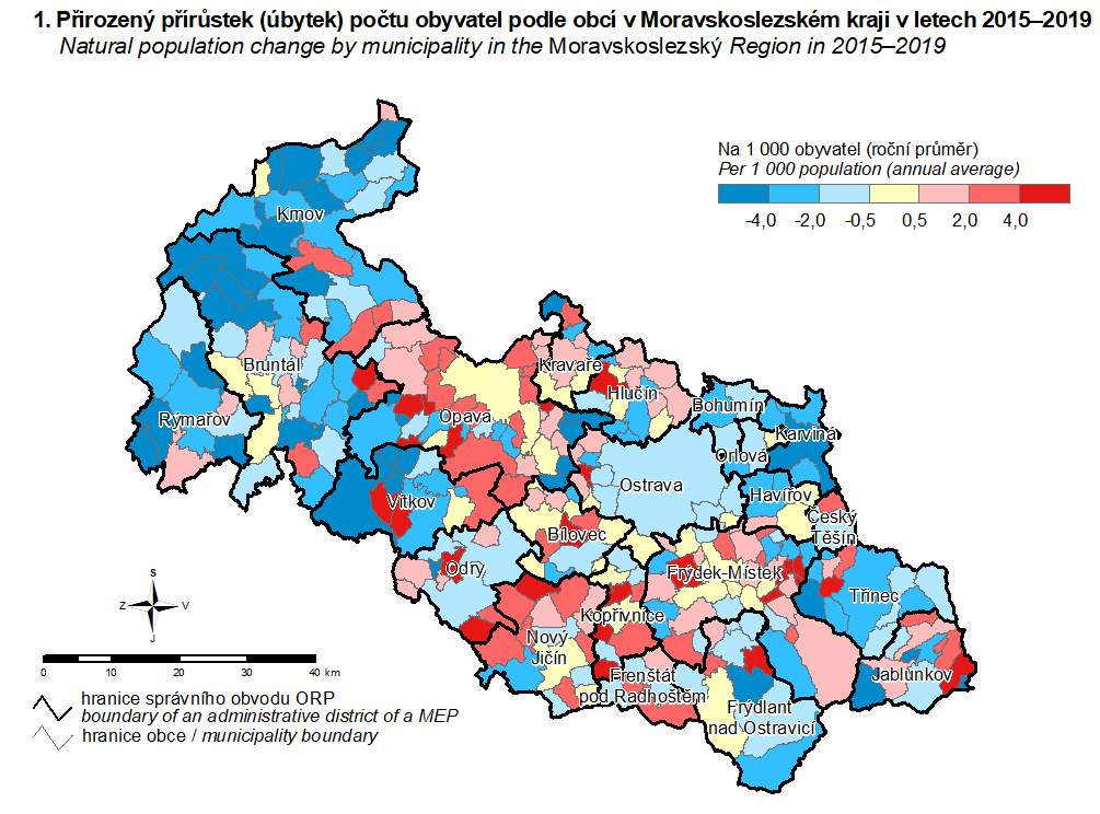 1. Přirozený přírůstek (úbytek) počtu obyvatel podle obcí v Moravskoslezském kraji v letech 2015–2019