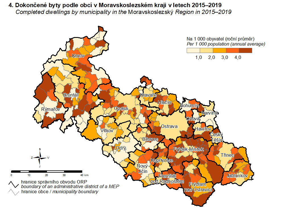 4. Dokončené byty podle obcí v Moravskoslezském kraji v letech 2015–2019