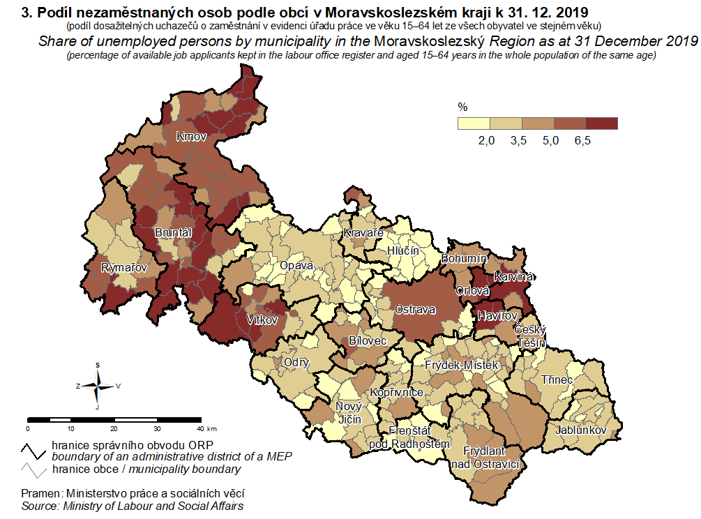 3. Podíl nezaměstnaných osob podle obcí v Moravskoslezském kraji k 31. 12. 2019