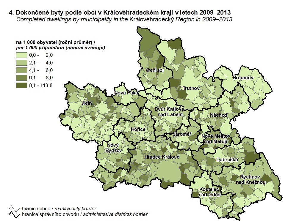 4. Dokončené byty podle obcí v Královéhradeckém kraji v letech 2009–2013