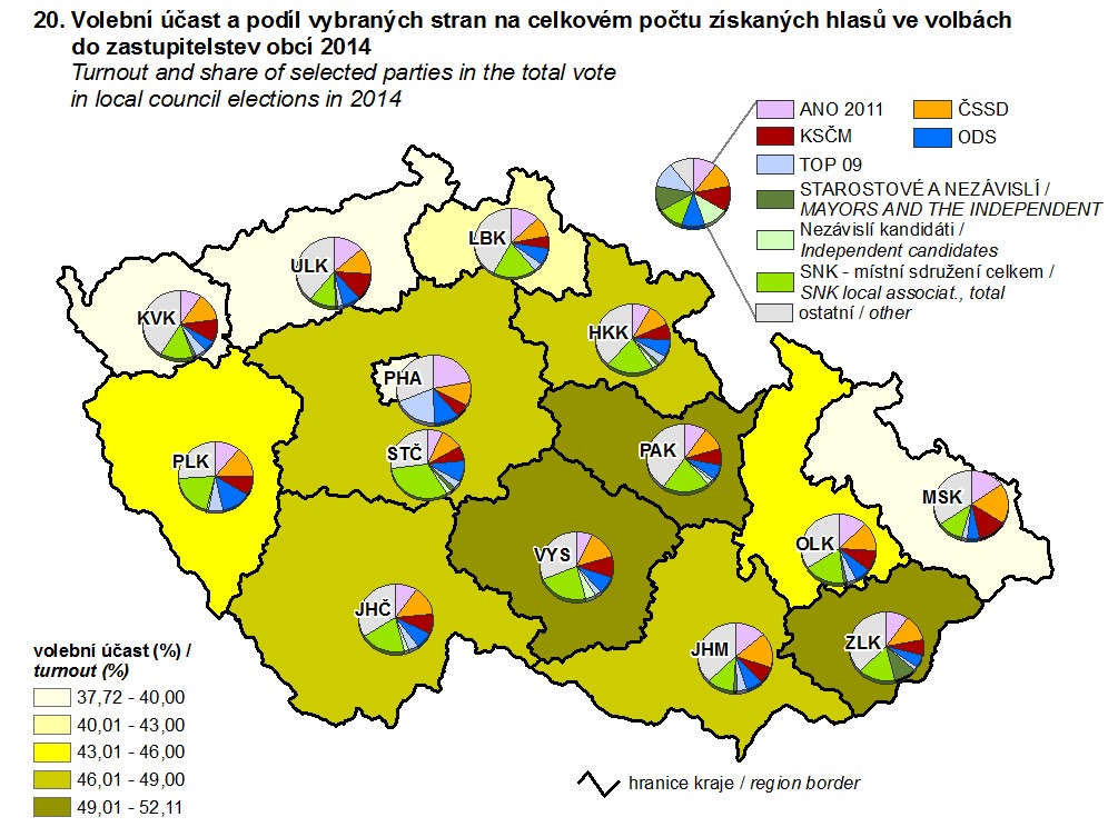 20. Volební účast a podíl vybraných stran na celkovém počtu získaných hlasů ve volbách do zastupitelstev obcí 2014