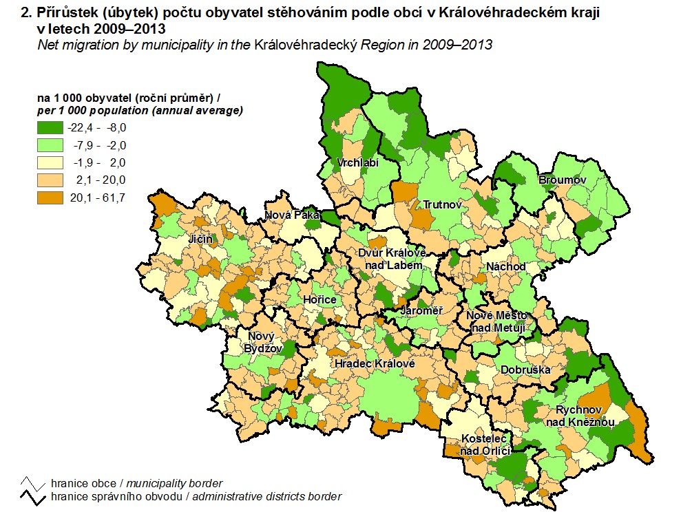 2. Přírůstek (úbytek) počtu obyvatel stěhováním podle obcí v Královéhradeckém kraji v letech 2009–2013