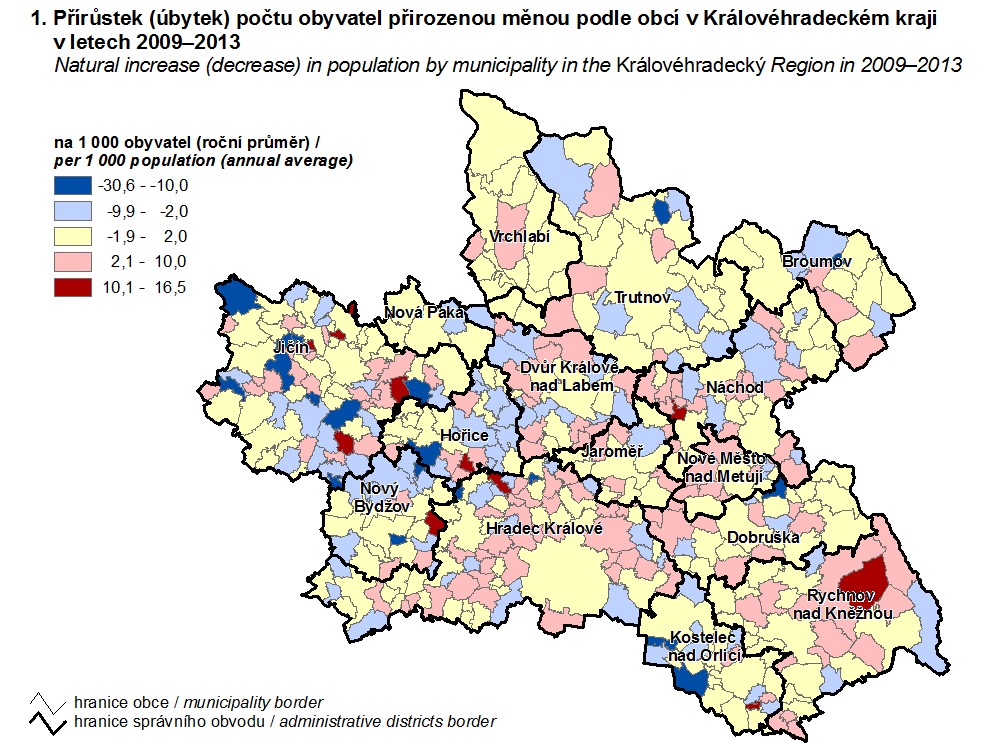 1. Přírůstek (úbytek) počtu obyvatel přirozenou měnou podle obcí v Královéhradeckém kraji v letech 2009–2013
