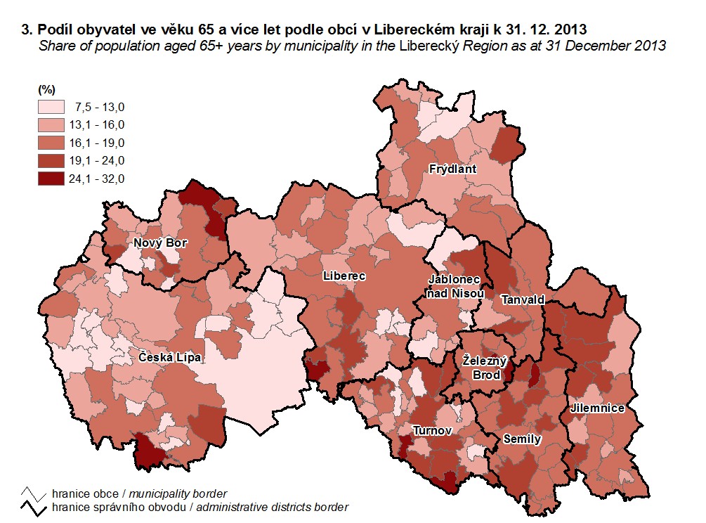 3. Podíl obyvatel ve věku 65 a více let podle obcí v Libereckém kraji k 31. 12. 2013