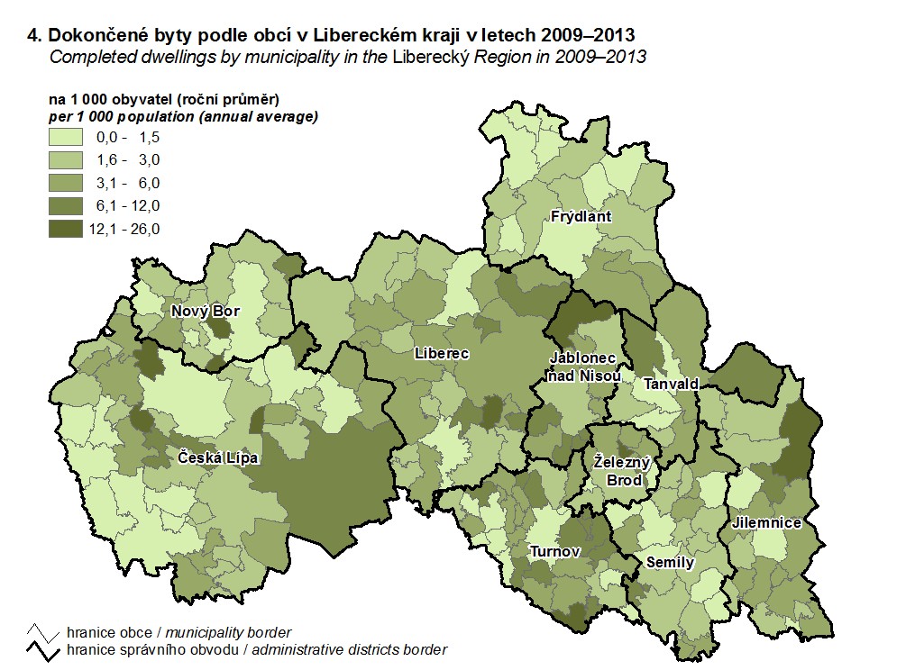 4. Dokončené byty podle obcí v Libereckém kraji v letech 2009–2013