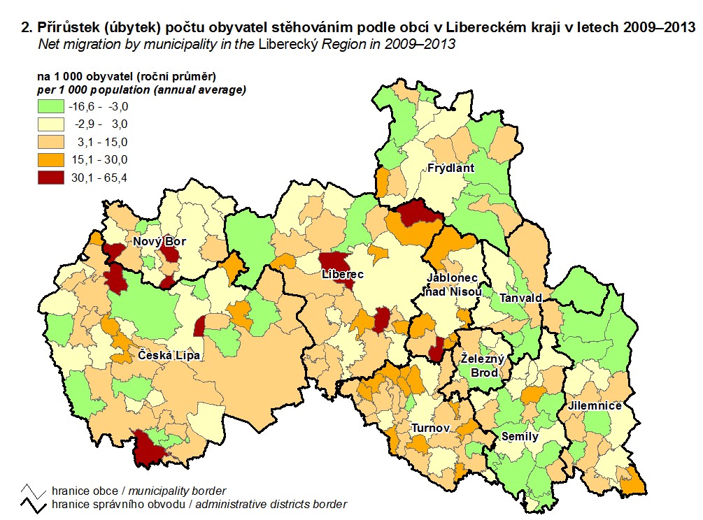 2. Přírůstek (úbytek) počtu obyvatel stěhováním podle obcí v Libereckém kraji v letech 2009–2013