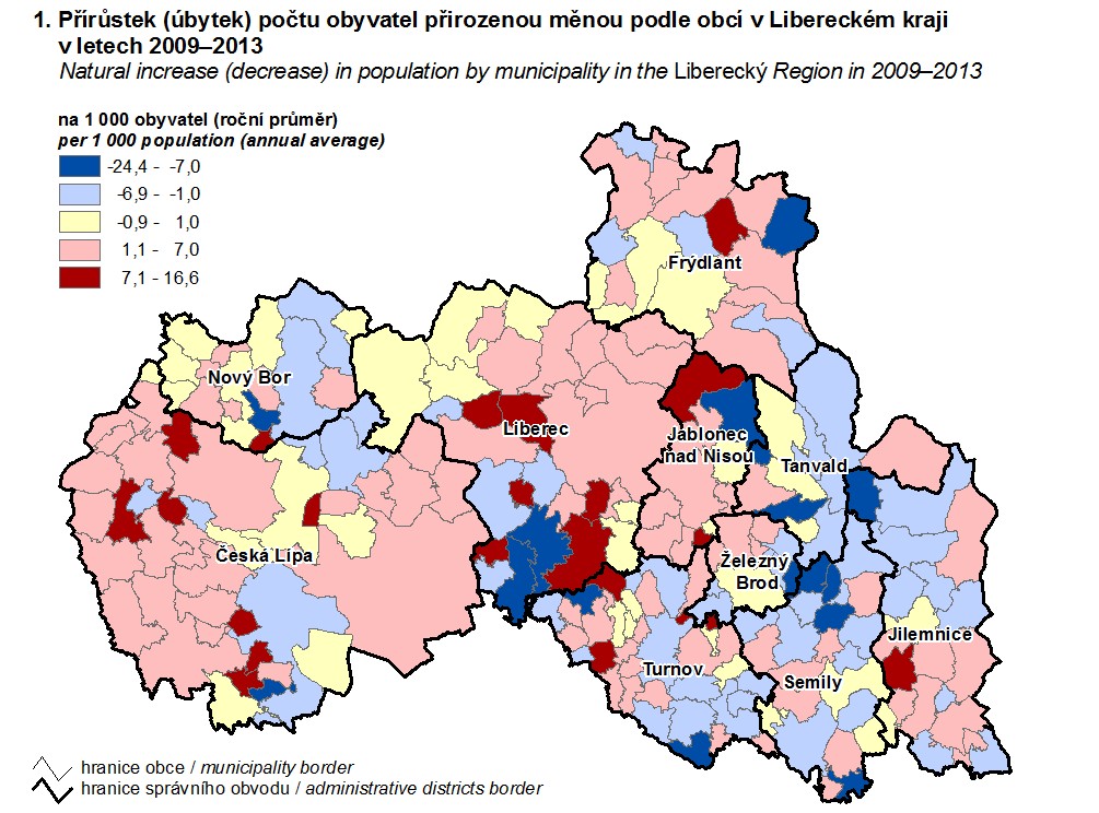 1. Přírůstek (úbytek) počtu obyvatel přirozenou měnou podle obcí v Libereckém kraji v letech 2009–2013