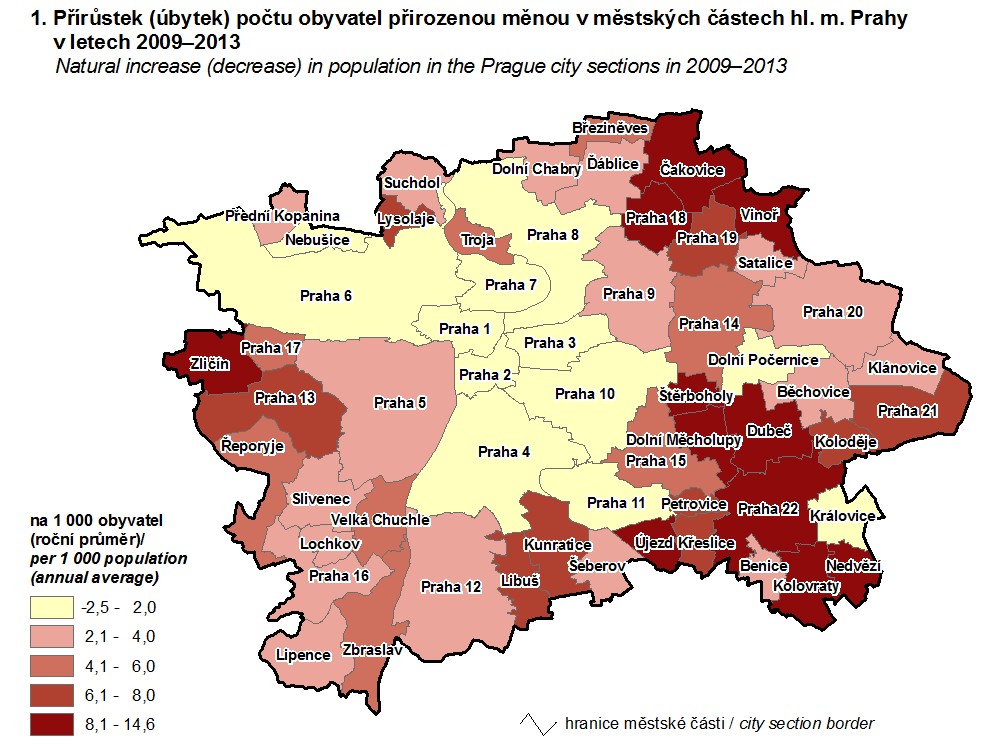 1. Přírůstek (úbytek) počtu obyvatel přirozenou měnou v městských částech hl. m. Prahy v letech 2009–2013