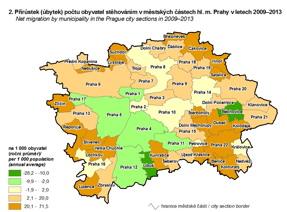 2. Přírůstek (úbytek) počtu obyvatel stěhováním v městských částech hl. m. Prahy v letech 2009–2013