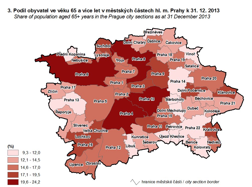 3. Podíl obyvatel ve věku 65 a více let v městských částech hl. m. Prahy k 31. 12. 2013
