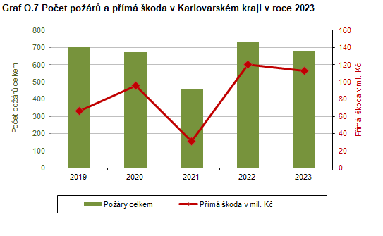 Graf O.7 Počet požárů a přímá škoda v Karlovarském kraji v roce 2023