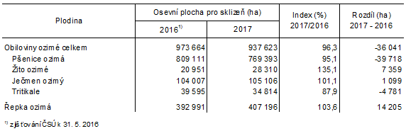 Ozimé obiloviny byly vysety na 938 tis. ha, tj. meziročně o 36 tis. ha méně (-3,7 %). K poklesu plochy došlo u pšenice ozimé o 40 tis. ha na 769 tis. ha (-4,9 %), u triticale o 5 tis. ha na 35 tis. ha (-12,1 %). Celkový úbytek ploch ozimých obilovin je částečně zmírněn nárůstem plochy žita o 7 tis. ha na 28 tis. ha (+35,1 %) a ječmene ozimého o 1 tis. ha na 105 tis. ha (+1,1 %).