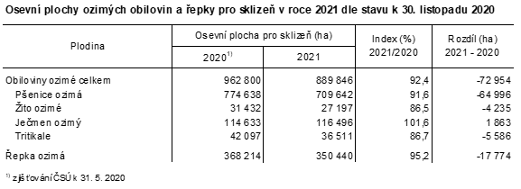 Ozimé obiloviny byly podle stavu k 30. listopadu 2020 vysety na 890 tis. ha, řepka na 350 tis. ha. Meziročně je plocha ozimých obilovin nižší o 73 tis. ha (-7,6 %), řepky ozimé o 18 tis. ha (-4,8 %).