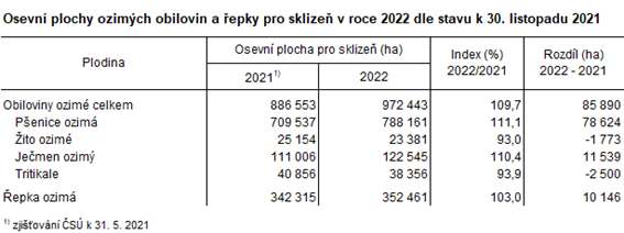 Ozimé obiloviny byly podle stavu k 30. listopadu 2021 vysety na 972 tis. ha, řepka na 352 tis. ha. Meziročně je plocha ozimých obilovin větší o 86 tis. ha (+9,7 %), řepky ozimé o 10 tis. ha (+3,0 %).
