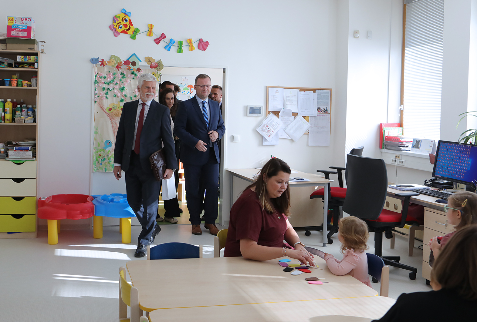 Na začátku pozdravil prezident republiky návštěvníky dětské skupiny, kterou ČSÚ zřídil pro děti svých zaměstnanců, a prohlédl si i sbírku historických sčítacích strojů.