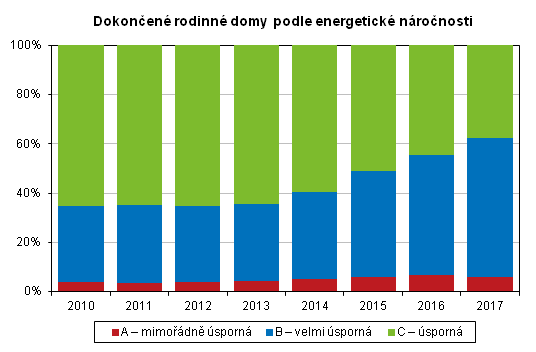 Z hlediska energetické náročnosti převažovala v roce 2017 při výstavbě třída B. Podíl rodinných domů s touto třídou dosáhl 56 %, v roce 2010 to bylo pouze 31 % všech domů. Současně s tím klesá zastoupení v kategorii C. Mimořádně úsporných rodinných domů (kategorie A) se loni dokončilo šest procent. Tento podíl se v čase zásadně nemění.