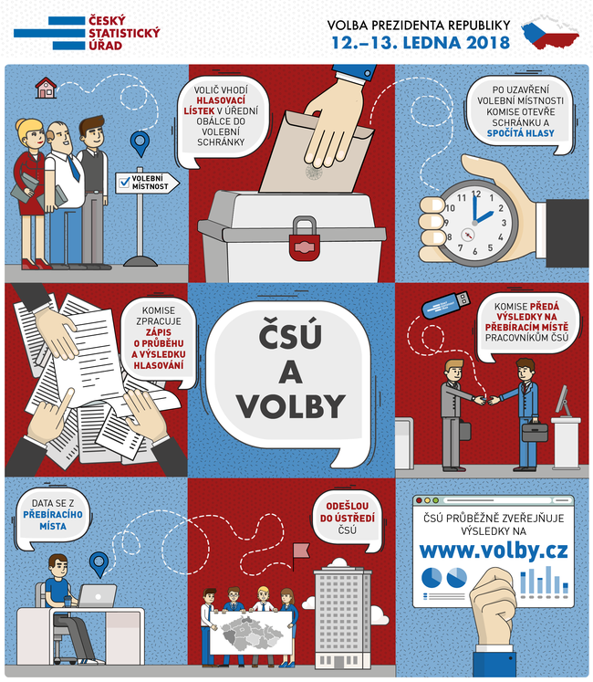 Sčítání hlasů zahájí okrskové volební komise po uzavření volebních místností. Následně zpracují zápisy o průběhu a výsledku hlasování. Správnost zápisů stvrzují všichni členové komisí svými podpisy. „Podepsaný zápis doručí komise na tzv. přebírací místo Českému statistickému úřadu. Pracovníci úřadu provedou kontrolu formální správnosti zápisu a vloží ho do systému. Poté jsou data v zabezpečené elektronické podobě odeslána do centra zpracování, kde jsou uložena do databáze. Okrskové výsledky jsou průběžně zveřejňovány na serveru volby.cz,“ říká místopředsedkyně ČSÚ Eva Krumpová. Celý proces zpracování výsledků voleb je názorně zobrazen v infografice ČSÚ.