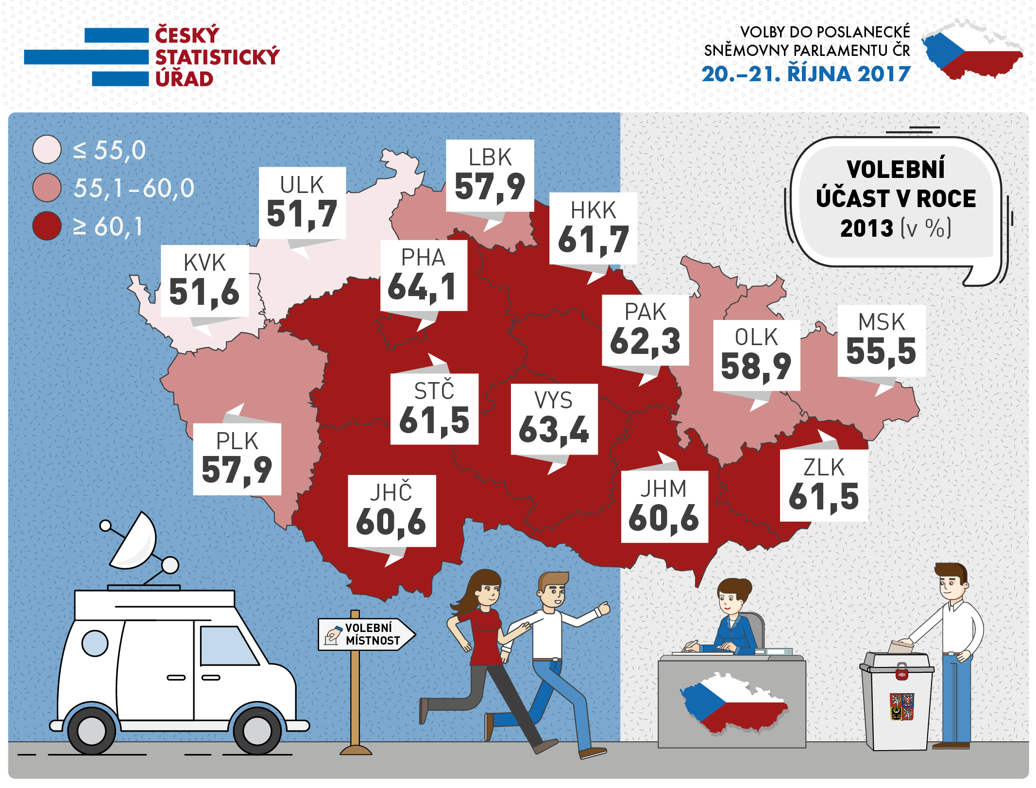 Při posledních parlamentních volbách v roce 2013 byla volební účast 59,5 %. Šlo o druhou nejnižší hodnotu od roku 1990. Nižší zájem projevili voliči o hlasování pouze v roce 2002, kdy jich přišlo k volbám do Poslanecké sněmovny 58 %. Před čtyřmi lety byla nejvyšší volební účast v Praze a nejnižší v Karlovarském kraji.