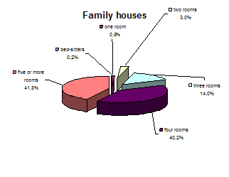 The average number of rooms per dwelling differs depending on the type of the building. In total for 2008, dwellings with four rooms plus a kitchen; small one-room dwellings and bed-sitters made up less than 15%. Large dwellings are prevailing in family houses: dwellings with five or more rooms plus a kitchen (41.8%) and dwellings with four rooms plus a kitchen (over 40%); the percentage of bed-sitters and dwellings with one room plus a kitchen is below one per cent. The structure of numbers of rooms per dwelling in the other categories differs. While dwellings with two rooms plus a kitchen prevailed among those built in new multi-dwelling buildings, as extensions to multi-dwelling buildings, dwellings obtained by conversion of non-residential spaces and new dwellings in non-residential buildings, dwellings with three rooms plus a kitchen were most represented in extensions to family houses. Quite a different situation was recorded for dwellings in residential and nursing care homes where dwellings with one room plus a kitchen including bed-sitters prevail.