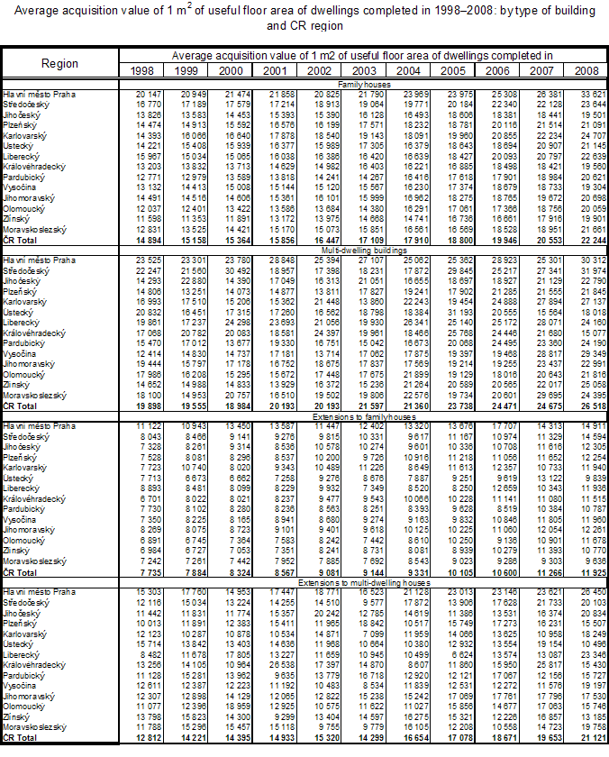 One of the most important indicators characterising dwellings completed is the acquisition value. The total acquisition value of dwellings newly completed in the Czech Republic in 2008 was CZK 91.5 billion (+5.7%). The tendency of increasing construction costs continued. The average acquisition value per dwelling grew in all categories of dwellings except dwellings obtained by conversion of non-residential spaces. In 2008 the average acquisition value per dwelling was CZK 3 088.0 million (+6.3%) in a new family house and CZK 1 889.3 million (+4.8%) in a multi dwelling building. However, these figures are not showing differences in the size between respective dwellings in terms of space and area. For this reason it is reasonable to compare categories of dwellings by respective units (m 3 and m 2). The average acquisition value per m 3 was CZK 4 221 (+7.2%) for new family houses and CZK 4 820 (+1.4%) for multi-dwelling buildings. A sharp increase was recorded also for acquisition value per m 2 of both living and useful area, namely in all the categories except new dwellings obtained by conversion of non-residential spaces. The average acquisition value per m 2 of living area of a new dwelling was CZK 31 725 (+6.5%). Increases for dwellings in family houses were 7.2% (new houses) and 8.6% (extensions), for dwellings in multi-dwelling buildings 7.9% (new buildings) and 8.3% (extensions). An increase was recorded also for acquisition value per m 2 of useful area, the value was CZK 22 534 in 2008 compared to CZK 21 263 in 2007 (+5.0%). Increases for dwellings in family houses were 8.2% (new houses) and 5.9% (extensions), for dwellings in multi-dwelling buildings 7.5% (both new buildings and extensions).