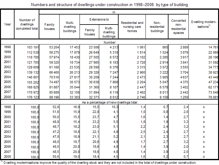 - prefabricated constructions decreased (in particular for multi-dwelling buildings – from 22.5% in 1997 to 3.8% in 2008);