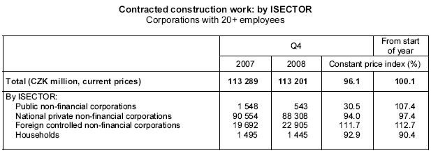In Q4 2008 construction work worth CZK 151 227 million was carried out. According to a CZSO estimate, small enterprises (up to 19 employees) produced roughly a fourth of the total construction output. The core of the construction sector was made by 2 510 enterprises with 20+ employees which carried out construction work valued at CZK 113 201 million (-3.9% year-on-year).