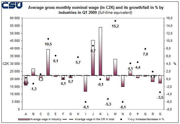 The total nominal average gross monthly wage 1 , full time equivalent , reached in Q1 2009 CZK 22 328, in the y-o-y comparison the increase was CZK 681. In the business sphere the average wage increased, y-o-y, by CZK 634 to reach CZK 22 331, in the non-business sphere by CZK 915 to CZK 22 311.