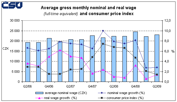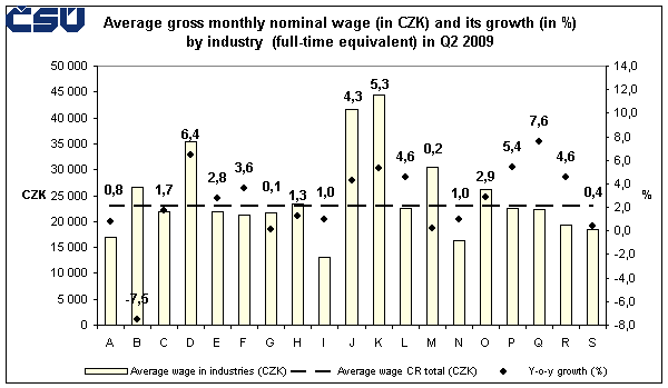 In the first half of 2009 many industries saw a low wage growth or even a decrease of nominal wage, y-o-y, which resulted into a real drop. Nominal average wage and real average wage decreased in 'mining and quarrying' (-6.6% and -8.3%, respectively) and 'other service activities' (-0.3% and -2.1%). The drop of real wage with the wage growth lower than inflation was recorded mainly in 'accommodation and food service activities' (nominal growth by 0.1%, real drop by 1.7%), in 'administrative and support service activities' (+0.2% and -1.6%) and in 'wholesale and retail trade; repair of motor vehicles and motorcycles' (+0.7% and -1.1%). On the other hand, in addition of the expected wage increase in 'human health and social work activities' and 'education' the above-standard growth of the average wage in the already mentioned industry 'electricity, gas, steam and air conditioning supply' was recorded (+8.2% and +6.3%).