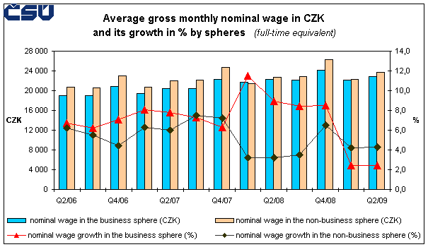The nominal average gross monthly wage per natural persons in the sample survey 2 reached in Q2 2009 CZK 23 664, in the y-o-y comparison the increase made CZK 579, i.e. 2.5%. In the business sphere the average wage increased, y-o-y, by CZK 511 to CZK 24 068, in the non-business sphere by CZK 966 to CZK 22 330. In the business sphere the increase was 2.2%, in the non-business sphere 4.5%.