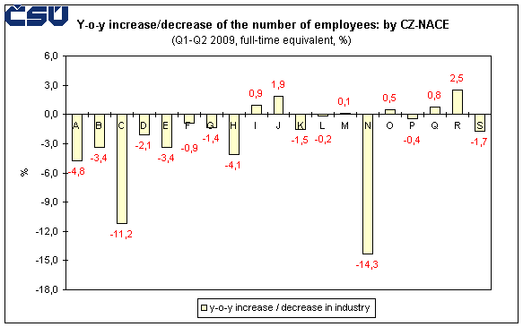 The impact of the economic crisis on the Czech economy shows in several statistical indicators: the y-o-y drop of the registered number of employees by almost 188 thousand persons is related to massive dismissals and cancellation of jobs which is observed mainly in industries and related activities (transport and storage) and where also the average number of hours worked per employee decreases. A marked drop of the number of employees was registered in labour offices (falling into 'administrative and support service activities'). The second main sphere are wages which, in the first half-year, showed a downward trend compared with the development in the previous years. This is related to measures adopted by employers in connection with the expected unfavourable situation (reduction and even freezing of wage growth (tariffs), cutting of special remunerations and other similar things), which will affect undoubtedly the development in the upcoming period of this year.