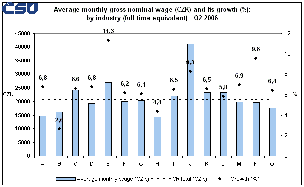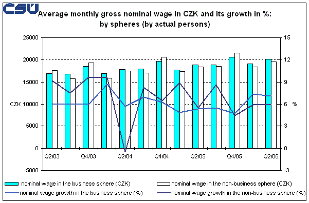In Q2 2006 the average wage per FTE person increased by CZK 1 326 year-on-year (+6.9%) to reach CZK 20 674, rising to CZK 20 654 (+7.1%, CZK +1 361) in the business sphere and CZK 20 745 (+6.1%, CZK +1 200) in the non-business sphere. The real wage increased by 3.9% in total, in the business sphere by 4.1% and by 3.1% in the non-business sphere.