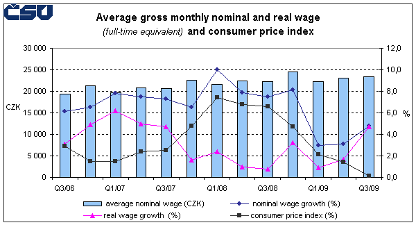 In Q1-Q3 2009 the average wage in the national economy , FTE, in total, accounted for CZK 22 896, i.e. 3.6% up (CZK 796) compared to the corresponding period of 2008. In the business sphere the average wage increased by 3.3% (CZK 730) to CZK 22 784, in the non-business sphere by 4.8% (CZK 1 075) to CZK 23 398. Real average wage in the national economy increased by 2.4%, y-o-y, in the business sphere by 2.1% and in the non-business sphere by 3.6%.