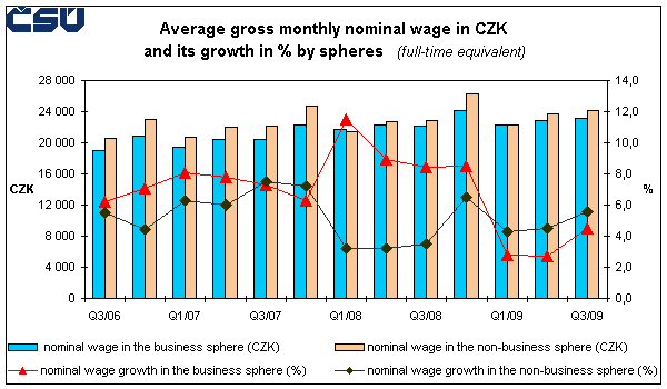 The nominal average gross monthly wage per natural persons in the sample survey 1 reached in Q3 2009 CZK 23 941, in the y-o-y comparison the increase made CZK 934, i.e. 4.1%. In the business sphere the average wage increased, y-o-y, by CZK 877 to CZK 24 232, in the non-business sphere by CZK 1 244 to CZK 22 967. In the business sphere the increase was 3.8%, in the non-business sphere 5.7%.