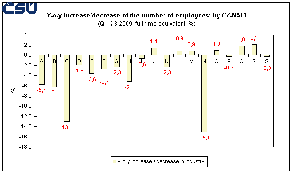 The results do not suggest that the labour market in the Czech Republic saw a revival. The development is still dominated by a dramatic y-o-y drop of the registered number of employees: in Q3 2009 the total of 279 thousand employees (-6.9%) were dismissed. The biggest loss of jobs was registered in industrial branches where 203 thousand employees, i.e. 14.9% were made redundant. In Q3 the drop of the number of employees in market services has either started or become more profound.