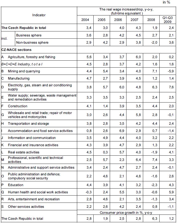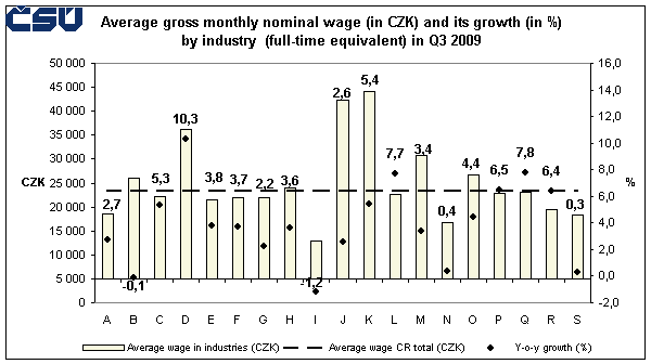 The highest nominal average wage was observed in the first three quarters of 2009 in 'financial and insurance activities' (CZK 47 572) and 'information and communication' (CZK 42 390) where the wage increased by 3.4 %, y-o-y, in both divisions and also in 'electricity, gas, steam and air conditioning supply' (CZK 36 976) where the average wage increased by 8.9%, y-o-y. The lowest average nominal wage was observed in 'accommodation and food service activities' (CZK 12 795) where a portion of labour income is obtained in form of a tip. The second lowest wages were reported for 'administrative and support service activities' (CZK 16 432); 'agriculture, forestry and fishing' (CZK 17 189) occupies the third place. The industry with the lowest average wage ('accommodation and food service activities') recorded a 0.2% drop, y-o-y, and for other two industries with the lowest average wages the y-o-y growth ranged from 1.1 – 1.4% which is notably below the nationwide average (3.6%).