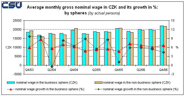In the business sphere the average wage increased year-on-year by CZK 1 390 to CZK 22 021, while in the non-business sphere it went up by CZK 912 to CZK 21 712. The relative increase of the average wage was 6.2%, the growth in the business sphere being 6.7% and in the non-business sphere 4.4%. In the same period, consumer prices went up by 1.5% and the real wage thus rose by 4.6% in total, in the business sphere by 5.1% and in the non-business sphere by 2.9%. The minimal wage was increased two times in the year 2006, namely on 1 January 2006 and on 1 July 2006, always by CZK 385 to CZK 7 955 in the second half-year of 2006, when its y-o-y increase was 10.7%.