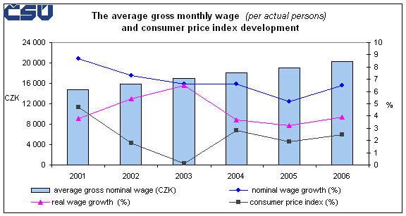 In 2006, the average wage was CZK 20 211, which compared to 2005 is an increase of CZK 1 226, i.e. 6.5%. Consumer prices increased by 2.5% in the same period, the growth of the real wage was 3.9%.
