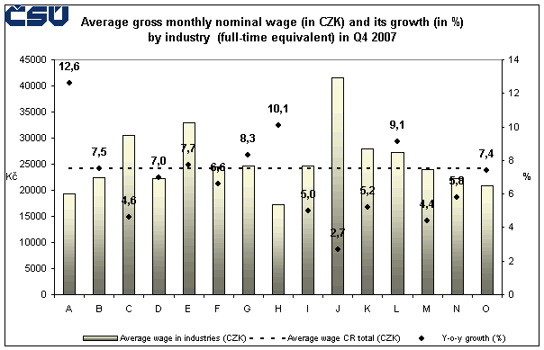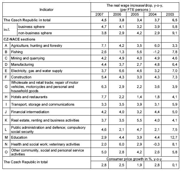 In Q4 2007, the average nominal gross monthly wage per FTE persons increased, y-o-y, by CZK 1,549 (+6.8%) and reached CZK 24,206; in the business sphere the increase was CZK 1,523 (+6.8%) rising to CZK 24,069 and in the non-business sphere to CZK 24,708 (+7.2%, CZK 1,653). Real wage increased y-o-y by 1.9% in total, in the business sphere also by 1.9% and by 2.3% in the non-business sphere.