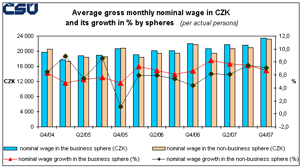 In Q1-Q4 2007 the nominal average gross monthly wage reached CZK 21,692 which was by CZK 1,485 more, year-on-year. In the business sphere the average wage increased year-on-year by CZK 1,525 to CZK 21,853, in the non-business sphere by CZK 1,333 to CZK 21,117. The relative increase of the average wage was 7.3 % in total, the growth in the business sphere being 7.5% and in the non-business sphere 6.7 %.