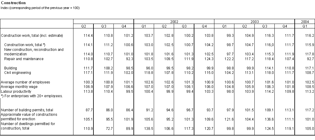 The 1st quarter 2004 employment in the construction industry was by 3.2% down year-on-year (LFSS). While the number of self-employed persons was by 4.3% up, that of employees dropped by 7.5%. Construction enterprises with 20+ employees in the first quarter of 2004 employed 148.1 thousand persons (+2.5% year-on-year) of which manual employees accounted for 95.1 thousand (+1.8%).