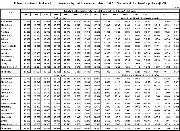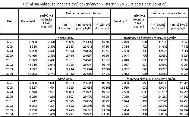 V roce 2004 pokračovala tendence zvyšování nákladů na výstavbu nových obytných objektů (s výjimkou přechodné stagnace v letech 2000 a 2001). V roce 2004 činila průměrná pořizovací hodnota bytu v novém rodinném domě 2 712,5 tis.Kč, ve srovnání s rokem 1997 byla o 568,5 tis. Kč (o 26,5 %) vyšší.