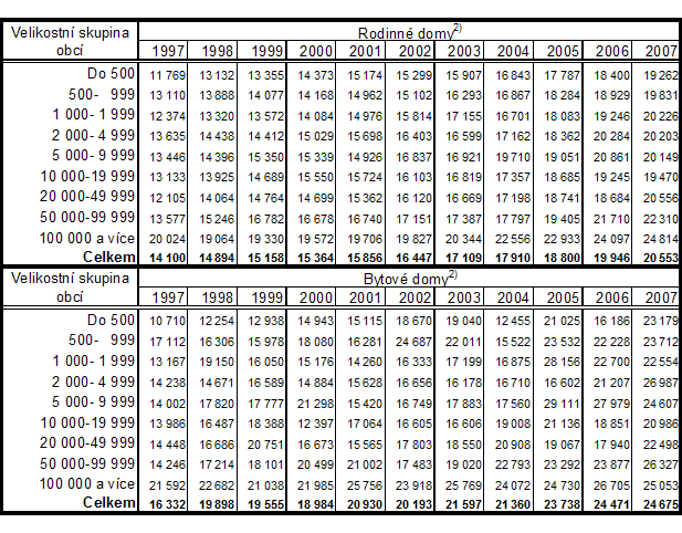 V roce 2007 pokračovala tendence zvyšování nákladů na výstavbu nových obytných objektů. Výjimkou jsou nové byty v bytových domech, kde v roce 2007 činila průměrná pořizovací hodnota bytu 1 646 tis.Kč, ve srovnání s rokem 2006 byla o 18 tis. Kč nižší.